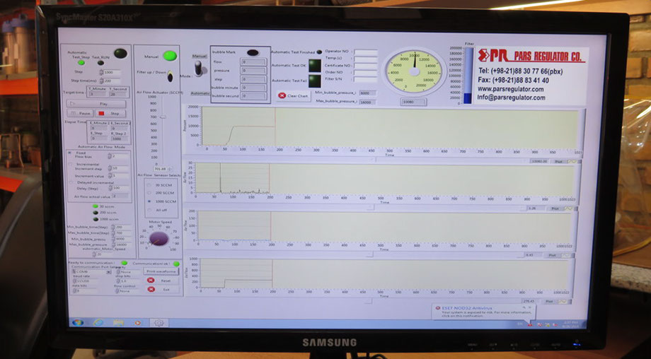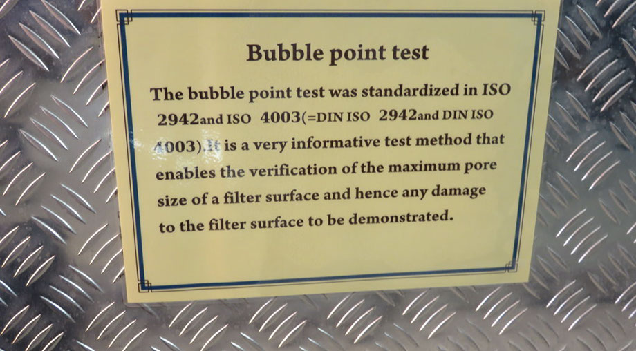 The procedure of a bubble point test is as follows: A controlled flow of gas is applied to one side of a wetted filter, with the tubing downstream of the filter submerged in a bucket of water. The exact amount of transferred air volume and the outcome pressure is measured. The first bubble point of filter quality appears and welding sections and aperture diameter of filter media is tested and finally the results will be reported to study.